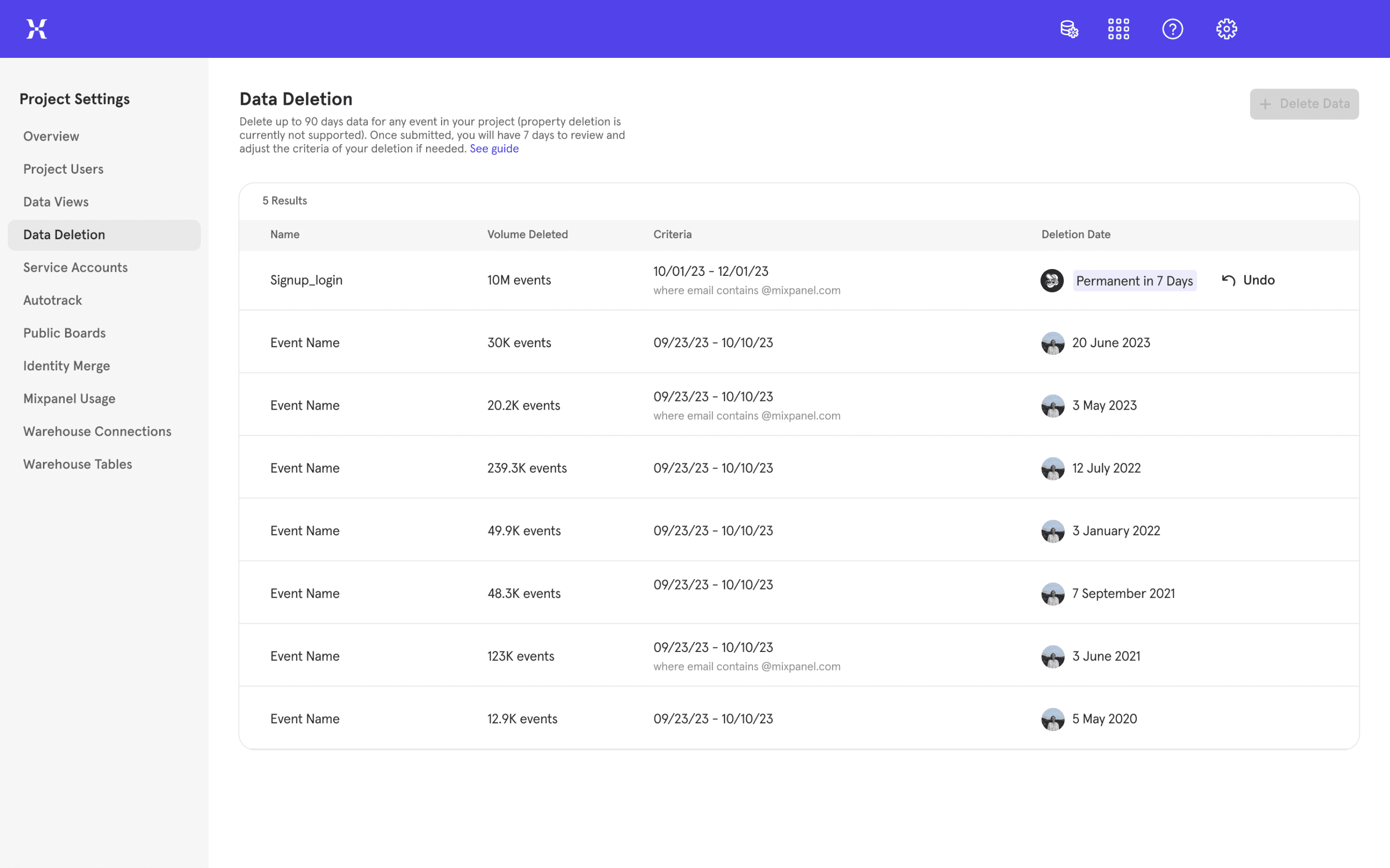 Data Deletion allows you to delete noisy or sensitive data from your Mixpanel project, helping you maintain the integrity of your analytics project, and preserve a clear view of user behavior.